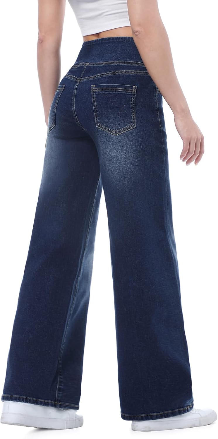 Baggy Jeans Damen,Pull On Wide Leg Jeans Mit Gummibund High Waist Stretch,Weites Bein Jeans Damen Mit 4 Taschen