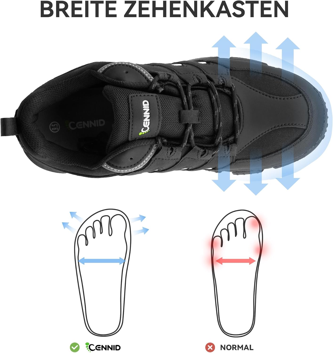 Der Text lautet „WASSERDICHT“. Das Produktbild zeigt einen schwarzen Sportschuh mit wasserdichten Eigenschaften, begleitet von fünf kreisförmigen Symbolen, die auf Produktmerkmale hinweisen.Der Text lautet „WASSERDICHT“. Das Produktbild zeigt einen schwarzen Sportschuh mit wasserdichten Eigenschaften, begleitet von fünf kreisförmigen Symbolen, die auf Produktmerkmale hinweisen.