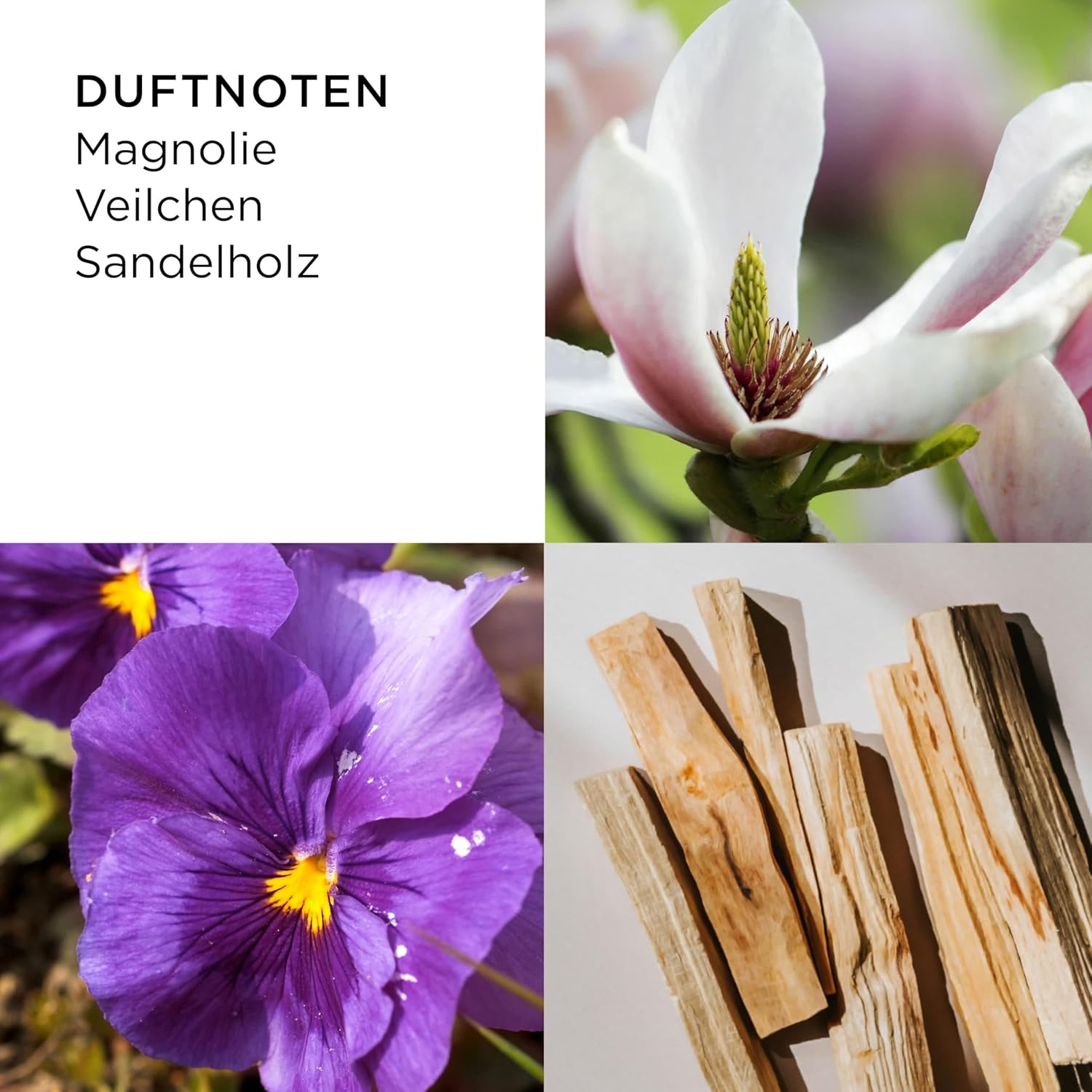 BLUMIGE UND FRUCHTIGE NOTEN Rosa Magnolie, Flieder und Pfirsich in der Kopfnote sorgen für Frische und Eleganz, die durch sanfte und erfrischende Zitrusnuancen ergänzt werden; Veilchen, Rose, Jasmin und Ylang-Ylang in der Herznote verleihen Wärme und ein Gefühl von Nostalgie; Bernstein und Sandelholz bilden die Basisnote und wirken wie ein natürliches Bindeglied, das die anderen Noten in Harmonie hält und die Haltbarkeit des Parfüms verlängert