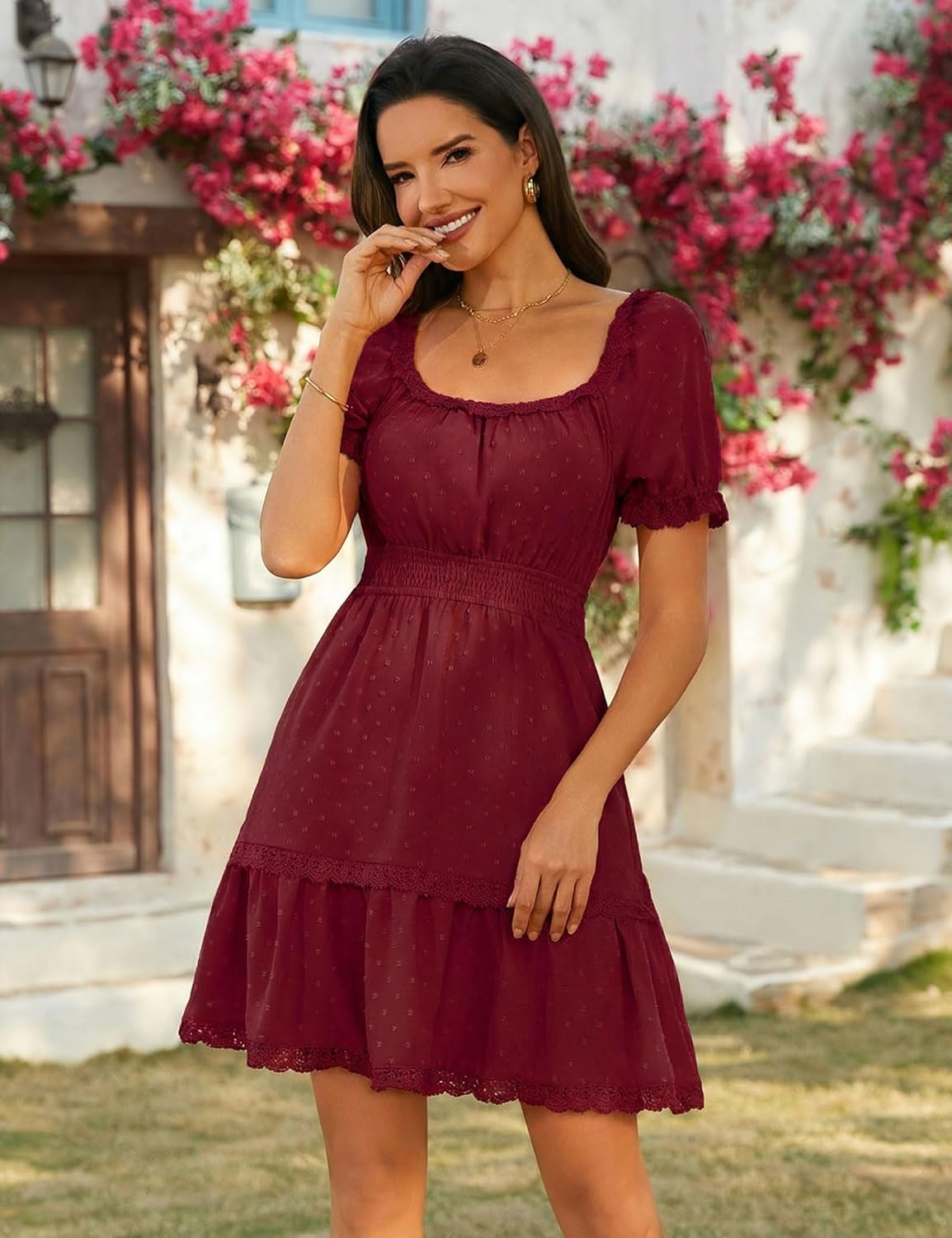 Florboom Damen Eckiger Ausschnitt Sommerkleid Boho Minikleid
