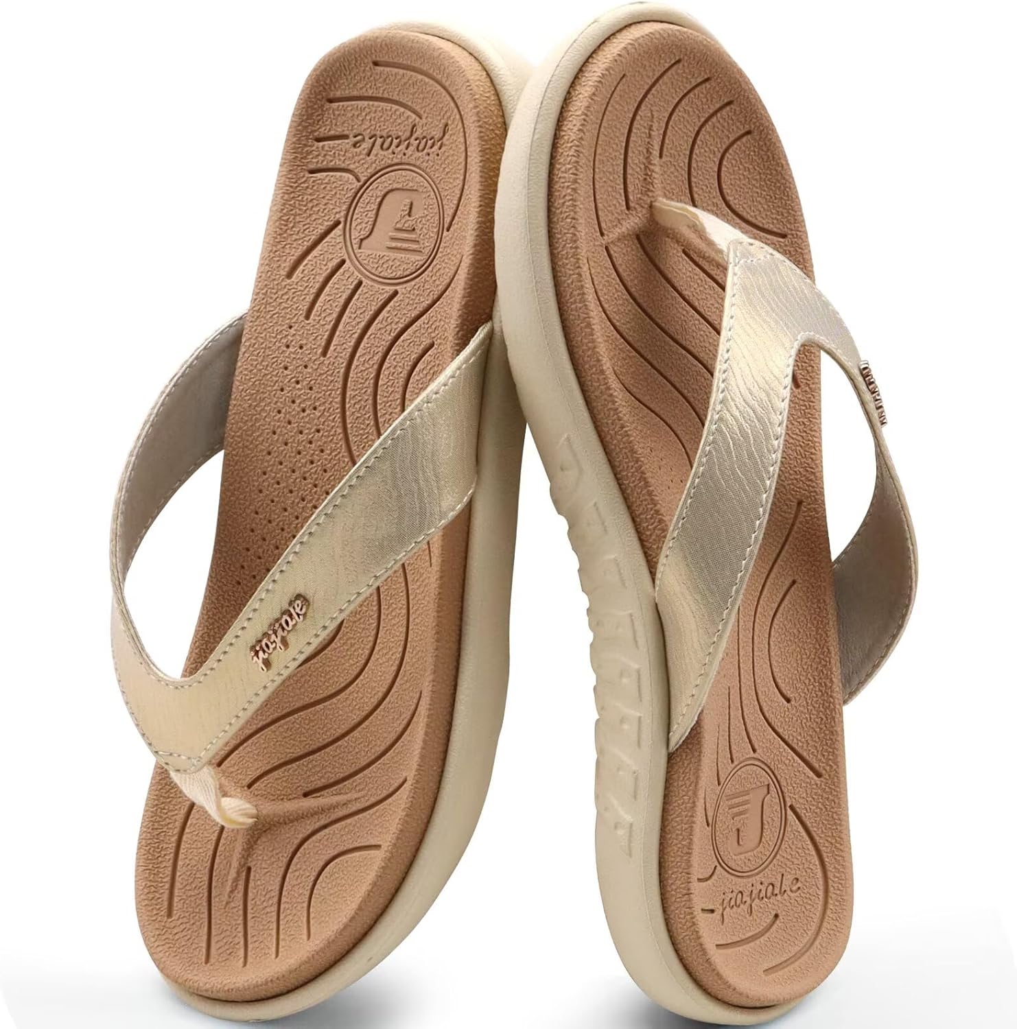 jiajiale Flip Flops Damen Mode Orthopädische Leder Stoff Leicht Zehentrenner Frauen Bequeme Yoga Fußbett Badelatschen Sommer Strand Rutschfest Feste Gummi Sohle