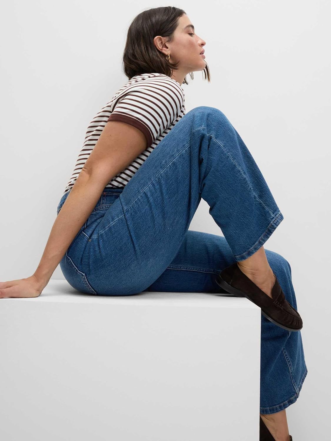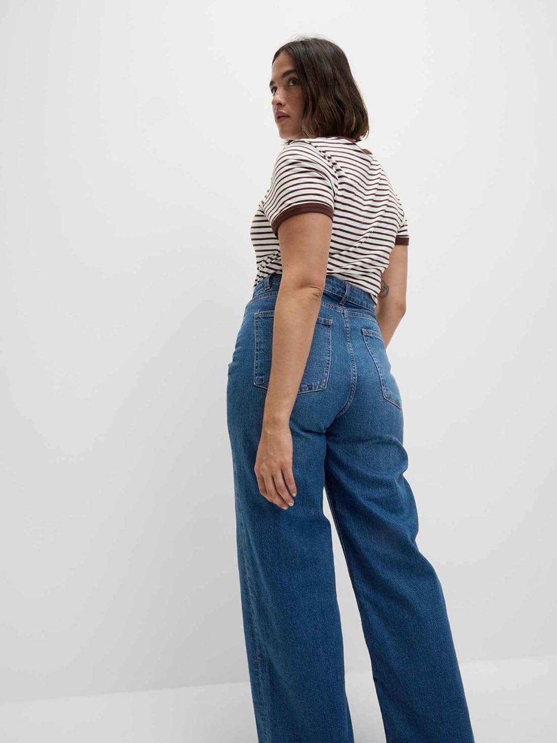 Jeans im Palazzo-Stil sind genauso unkompliziert zu tragen wie ihr engster Verwandter – die Wide-Leg-Jeans – und es gelten die gleichen Styling-Regeln. Gleichen Sie die markante Silhouette mit einem figurbetonten Oberteil aus und stecken Sie es immer ganz oder halb in den Bund, um die Taille zu betonen. Palazzo-Jeans haben jedoch eine fließendere Form, mit mehr Weite an Hüfte und Bein als die Wide-Leg, und sind daher ideal für einen entspannten Look.