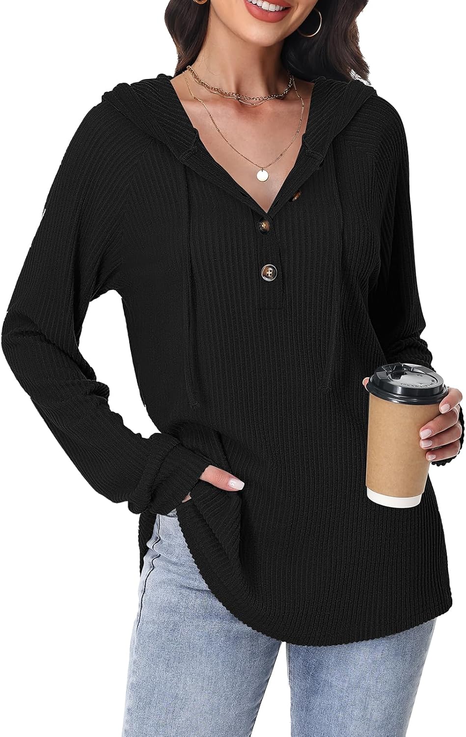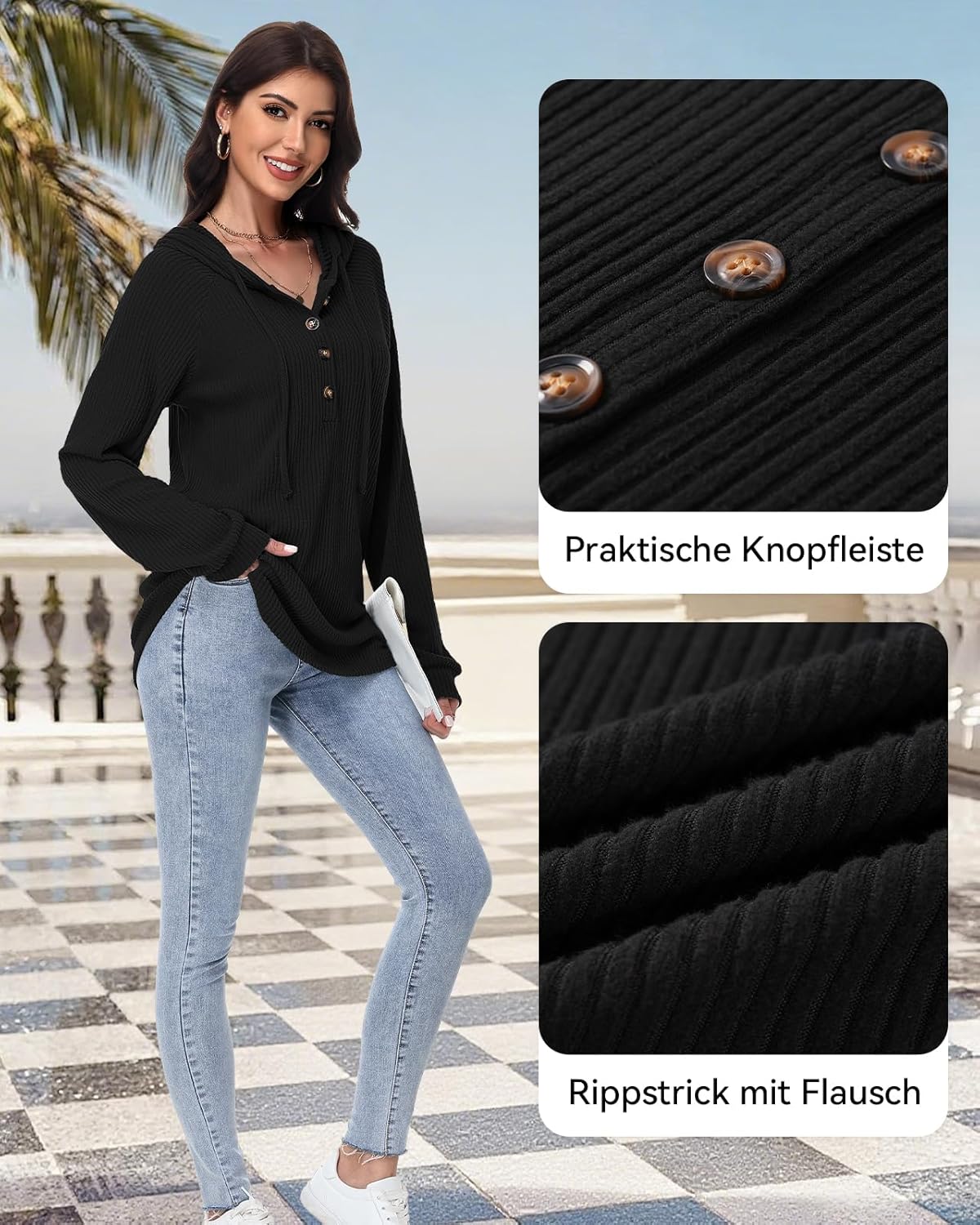 Pullover Damen Hoodie V-Ausschnitt Kapuzenpullover Knopfleiste Leichter Strickpullover Langarm Sweatshirt Tops