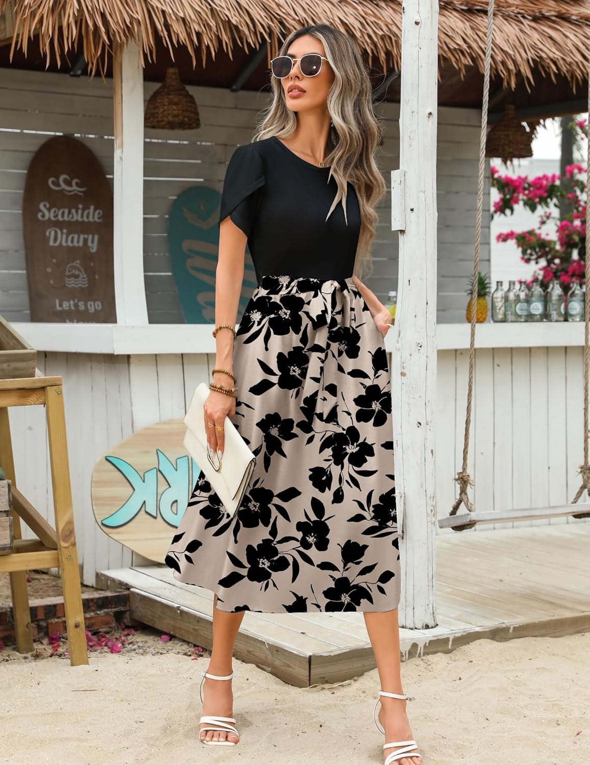 ZEAGOO Sommerkleid Damen Elegant Kleider Kurzarm Rundhals Midikleid A-Linie Blumenkleid Casual Tunika Kleid Hohe Taille Strandkleid mit Taschen S-XXL